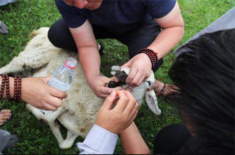 一隻羊跳躍時扭傷腳,經過餵食寶丸、誦經回向、按摩、注射治療藥物後,健康的回歸羊群