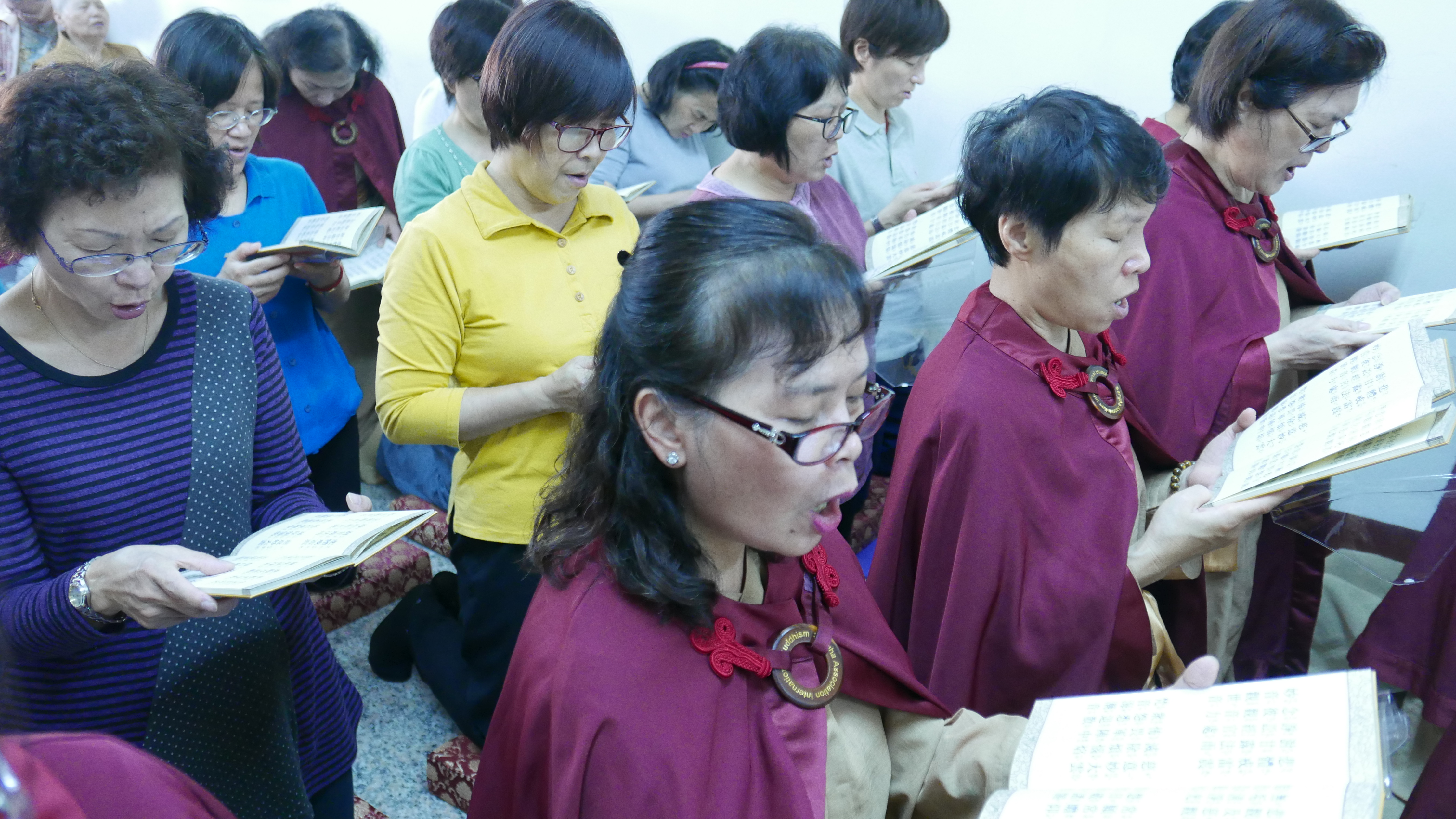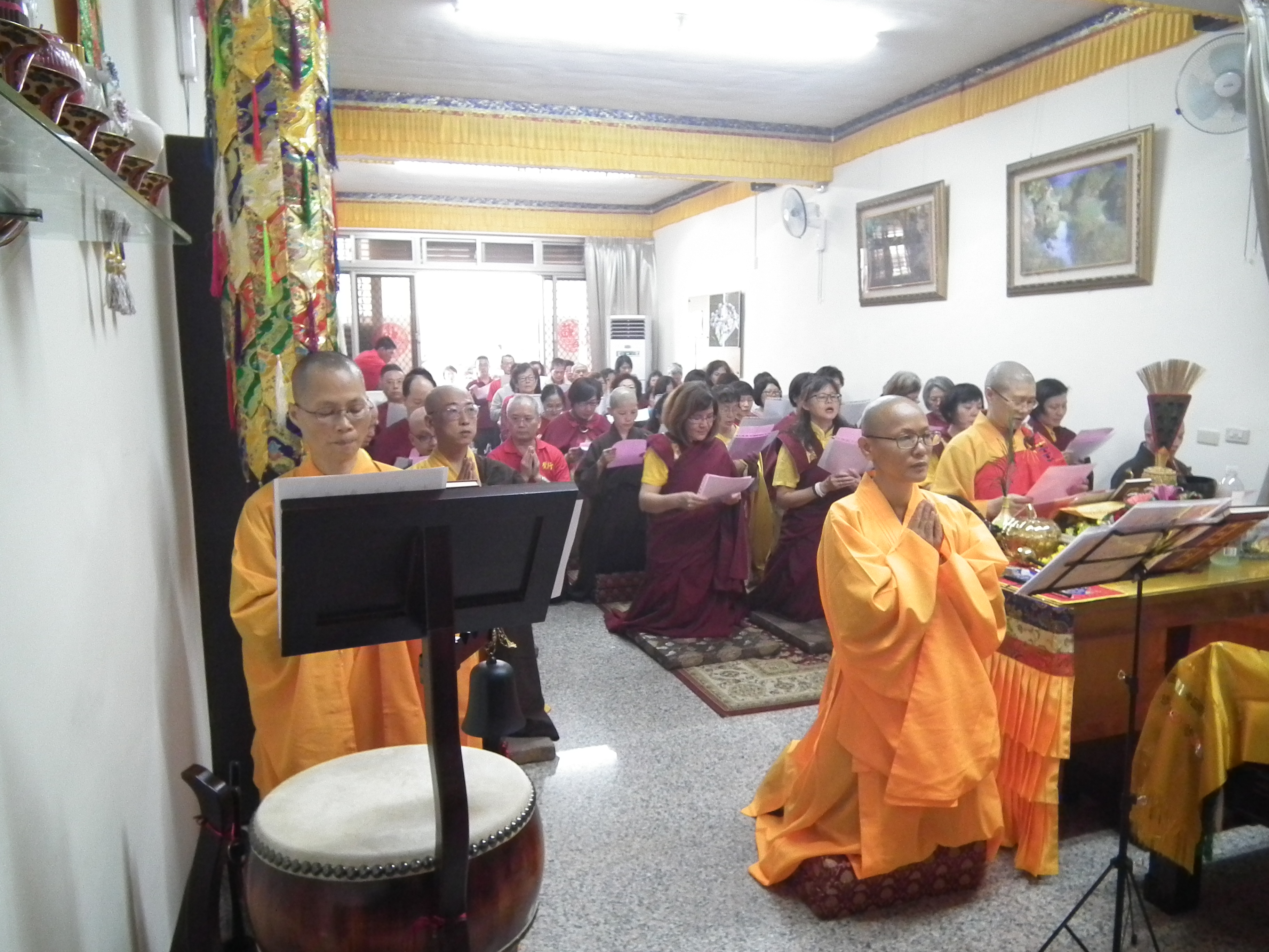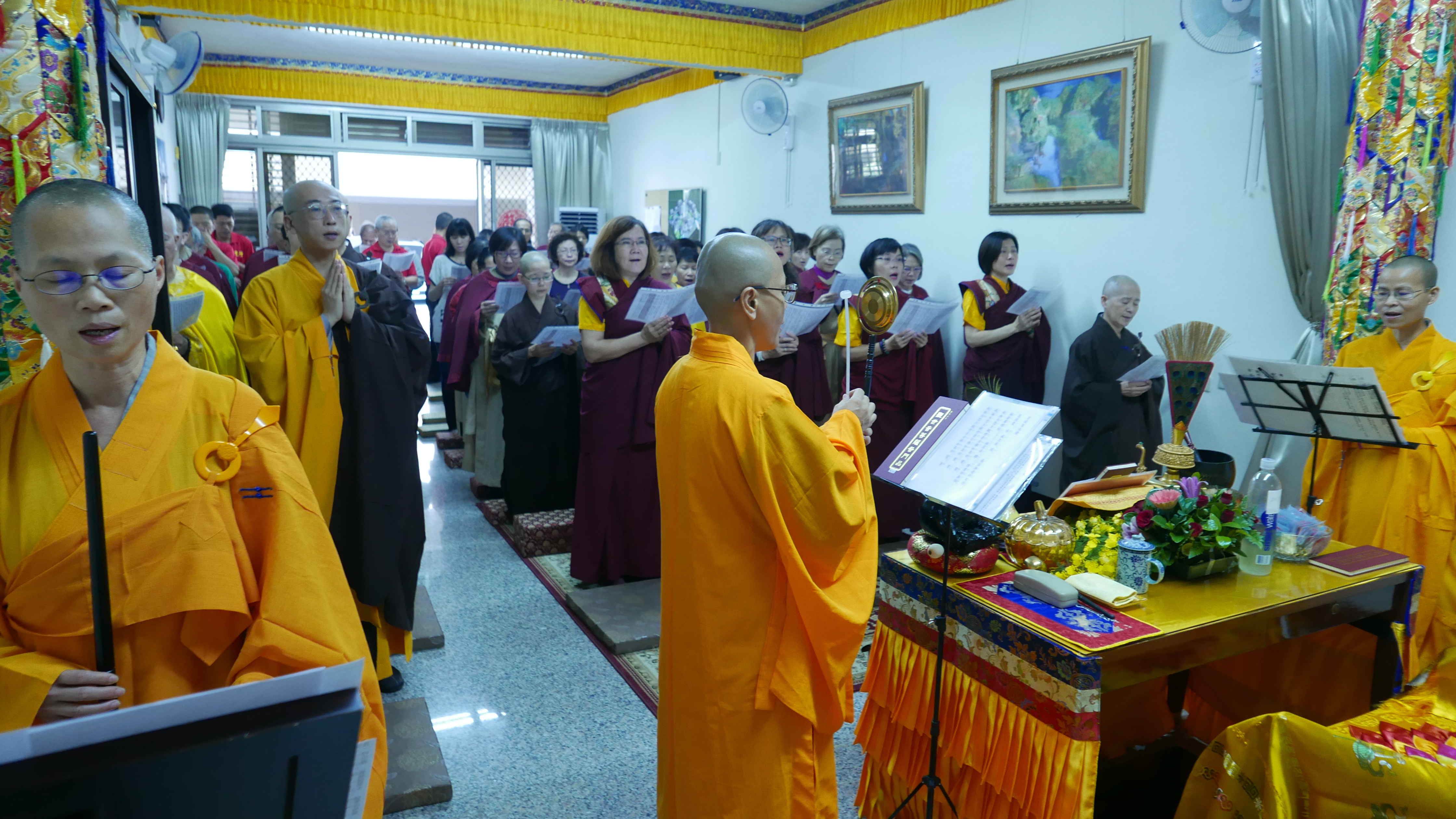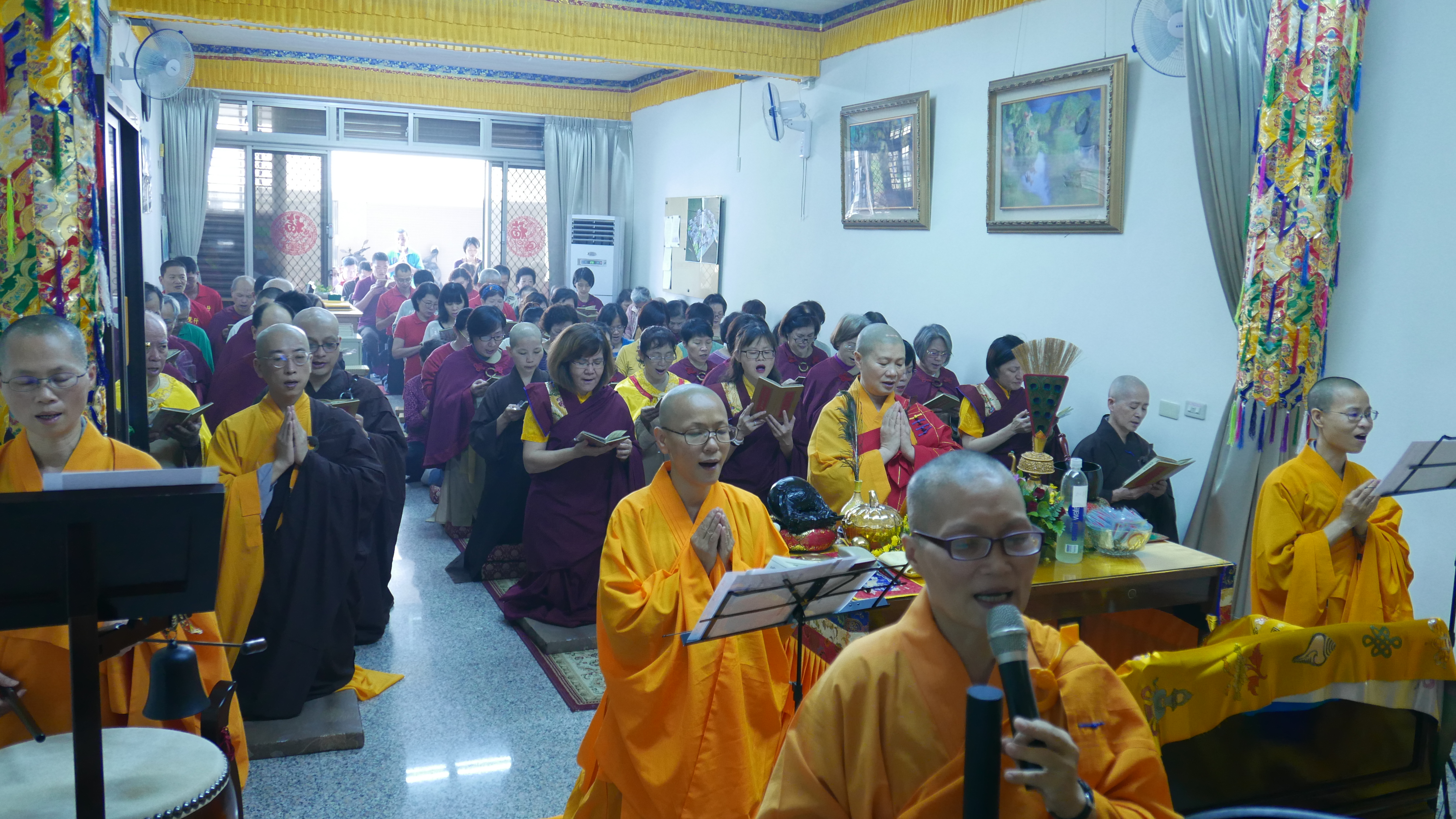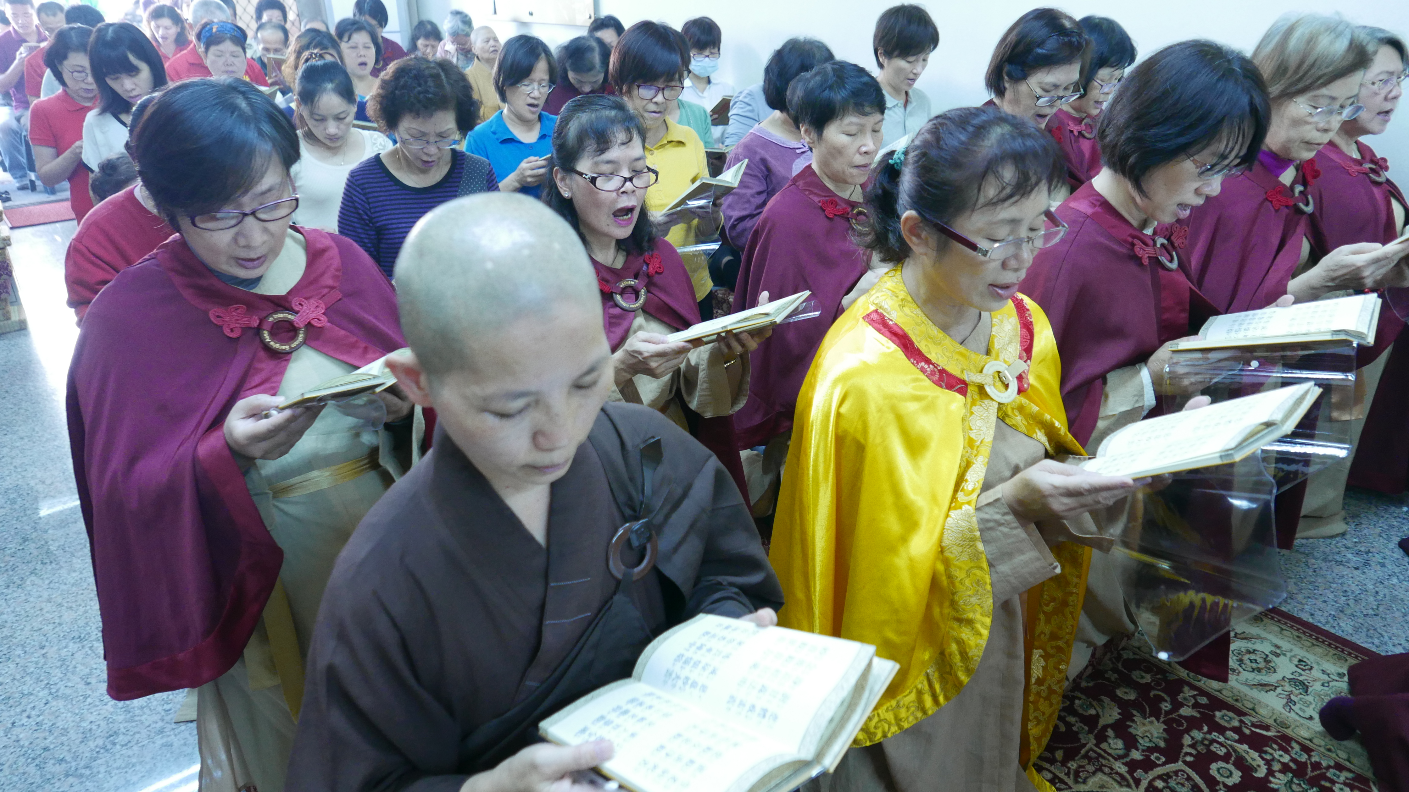 會場滿滿的與會師兄姐恭敬虔誠,主法聖德上人領眾恭誦《妙法蓮華經觀世音菩薩普門品 》,法喜受用滿滿。