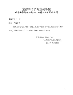 聖德高僧們的重要答覆 第二十四道答案: 能隔石建壇的巨聖德,絕對已經具備「送菩薩一表」的道行和「先知 預言」的道行,是百分之百不退地大摩訶薩再來的巨聖。 世界佛教總部諮詢中心 代大聖德們執筆回答提問 2018 年 3 月 11 日 1